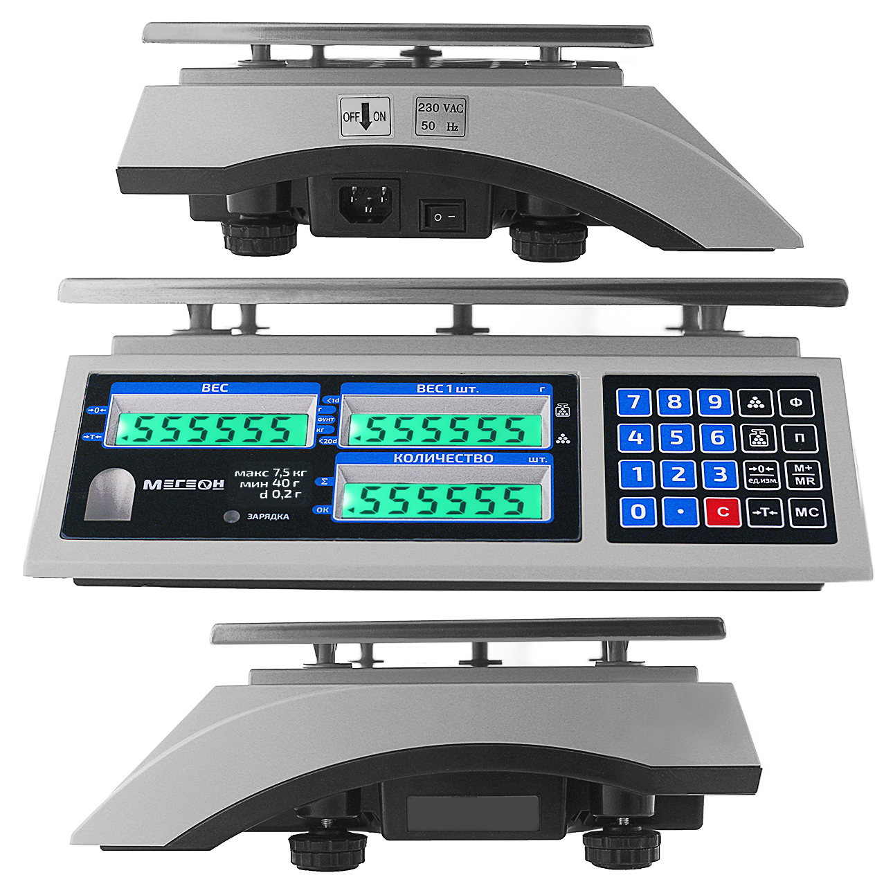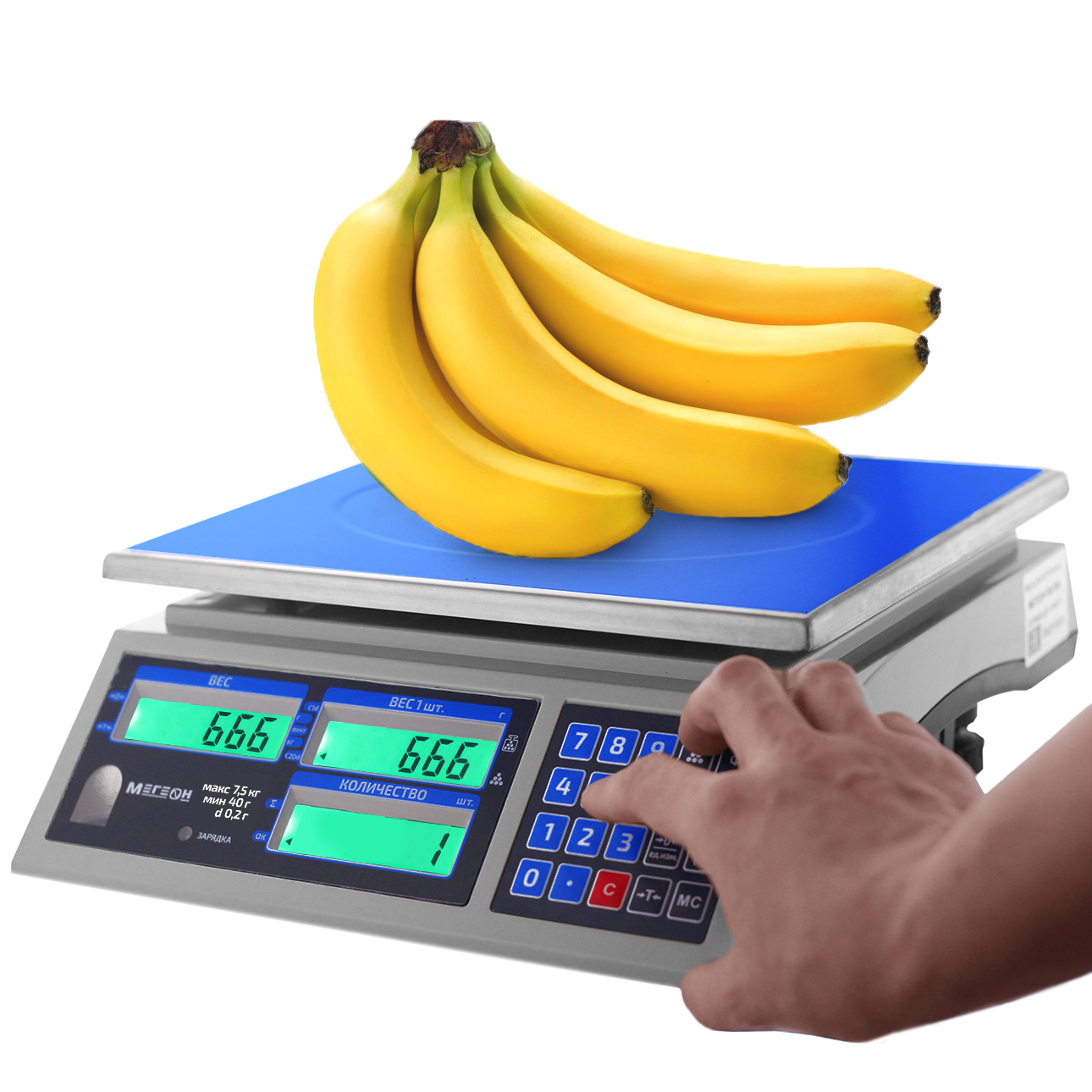 Магазинные весы с электронно-цифровым управлением. Диапазон от 0,2 до 7500 грамм. Функции весового контроля: подсчёт количества объектов на грузовой платформе, их суммирование и количественный учёт. 3 ЖК дисплея. Автономная работа.